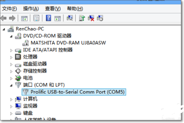 4、在电脑的“设备管理器”里面看,Com口转USB线的驱动安装的是哪个Com口(这个是Com5)。